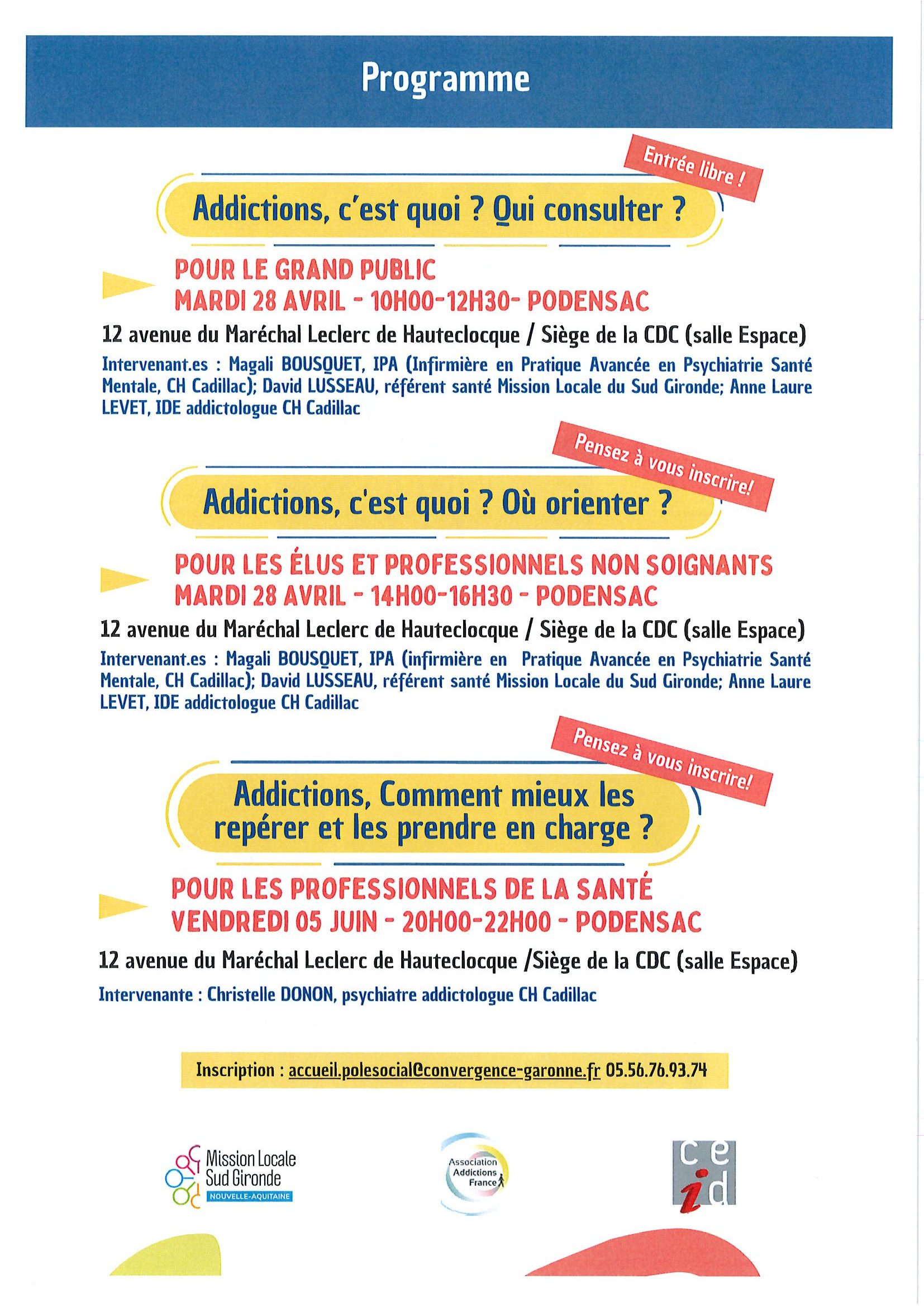 La filière d’addictologie du Centre Hospitalier de Cadillac, en partenariat avec la CDC Convergence Garonne, organise des ateliers gratuits pour apprendre à les repérer et orienter.