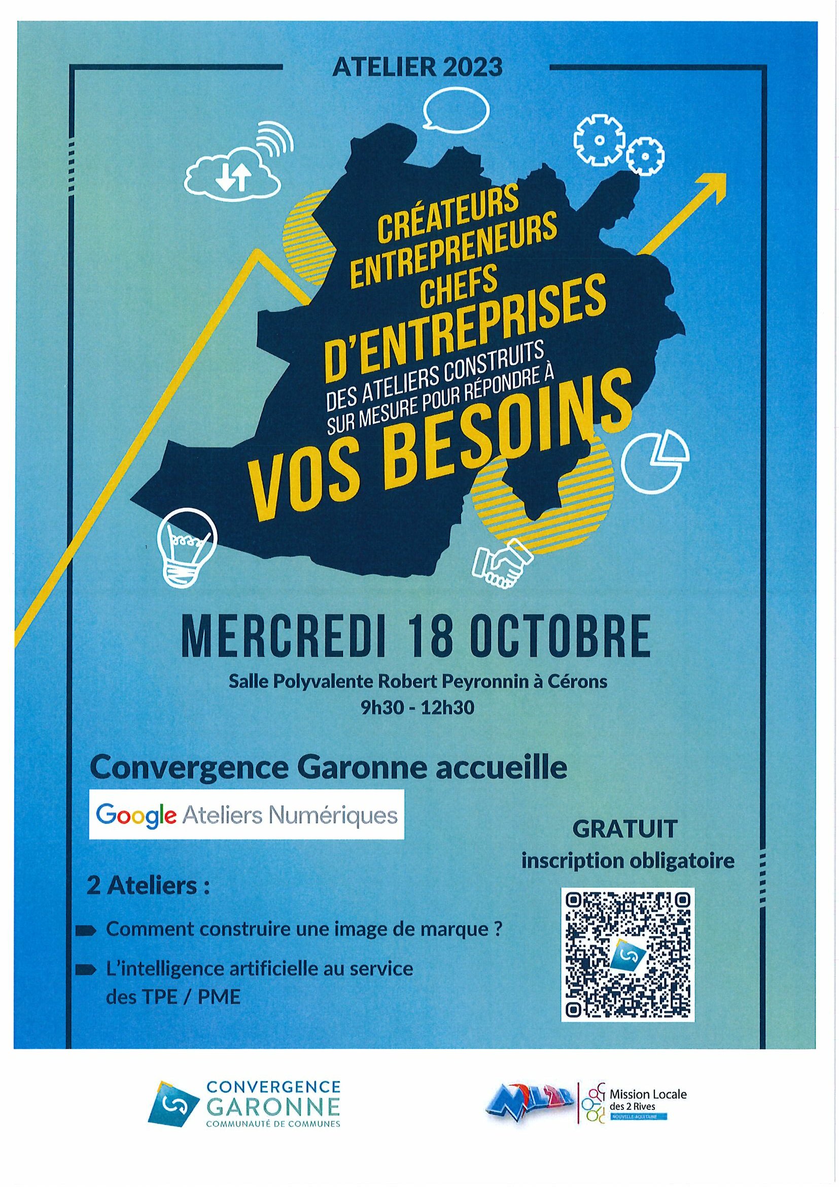 Mercredi 18 octobre de 9H30 à 12H30 à CERONS, les Ateliers Numériques de Google viennent animer 2 ateliers pour les chefs d’entreprise, entrepreneurs et créateurs d’entreprise.
