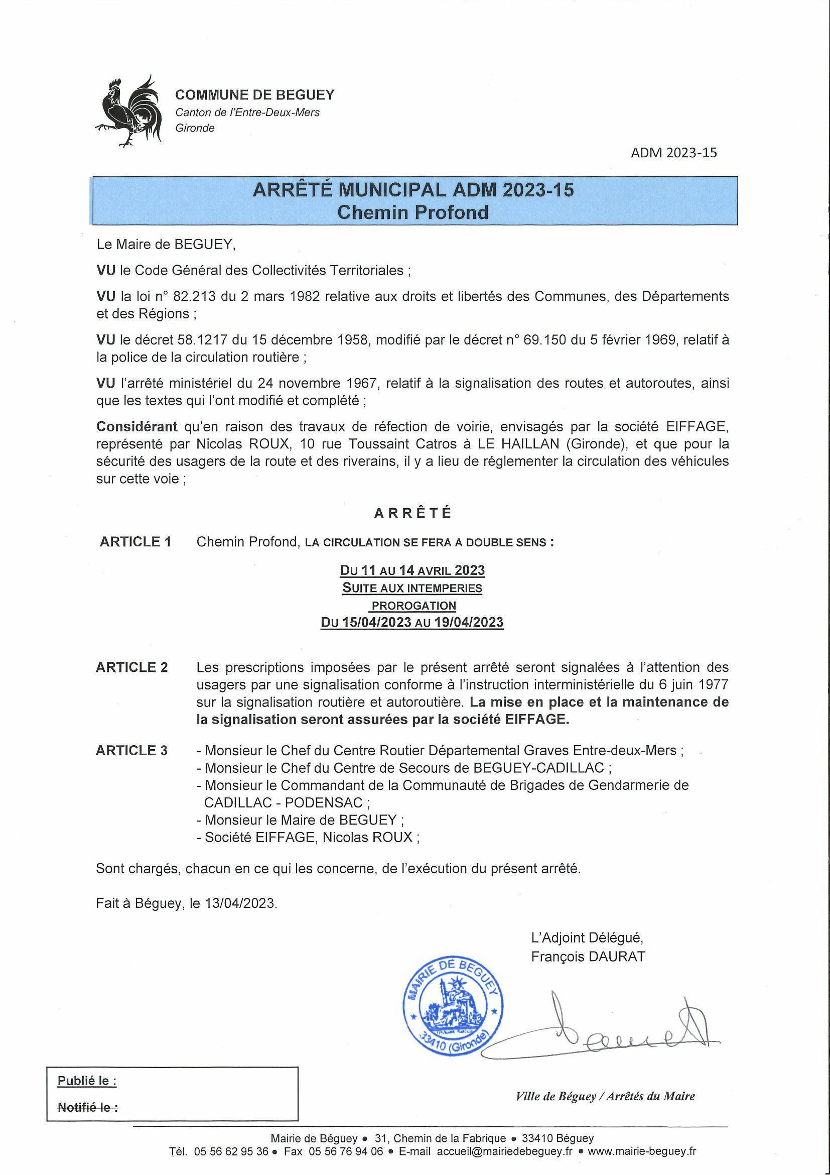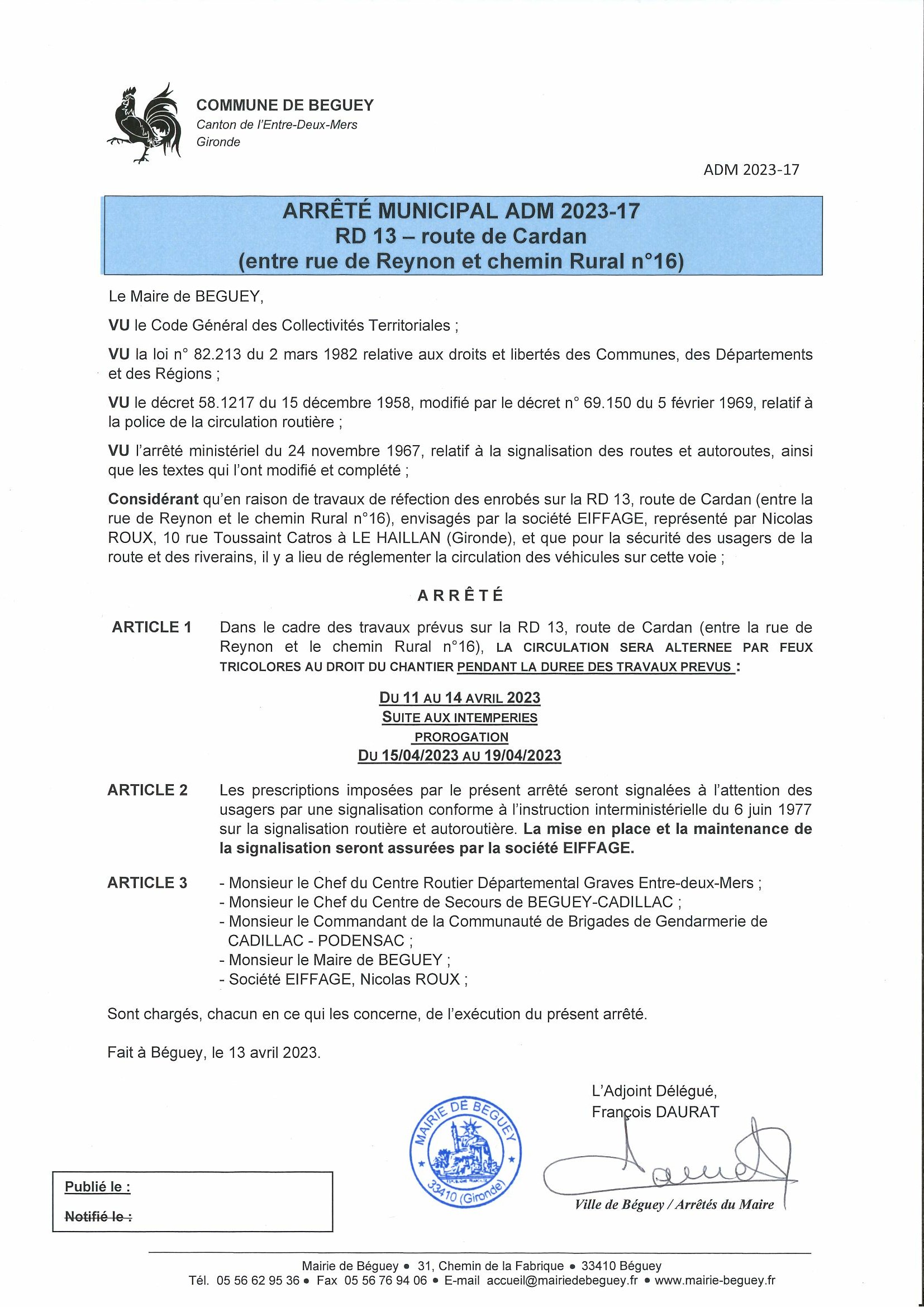 PROROGATION DES ARRETES DE CIRCULATION - TRAVAUX SUR RD 10E7 (avenue de la Libération) ET RD 13 (route de Cardan)