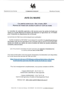 Le caractère de calamités agricoles a été reconnu pour les pertes de fonds sur vignes au Comité National de Gestion des Risques en Agriculture du 17/11/2021 pour l’ensemble du département de la Gironde.