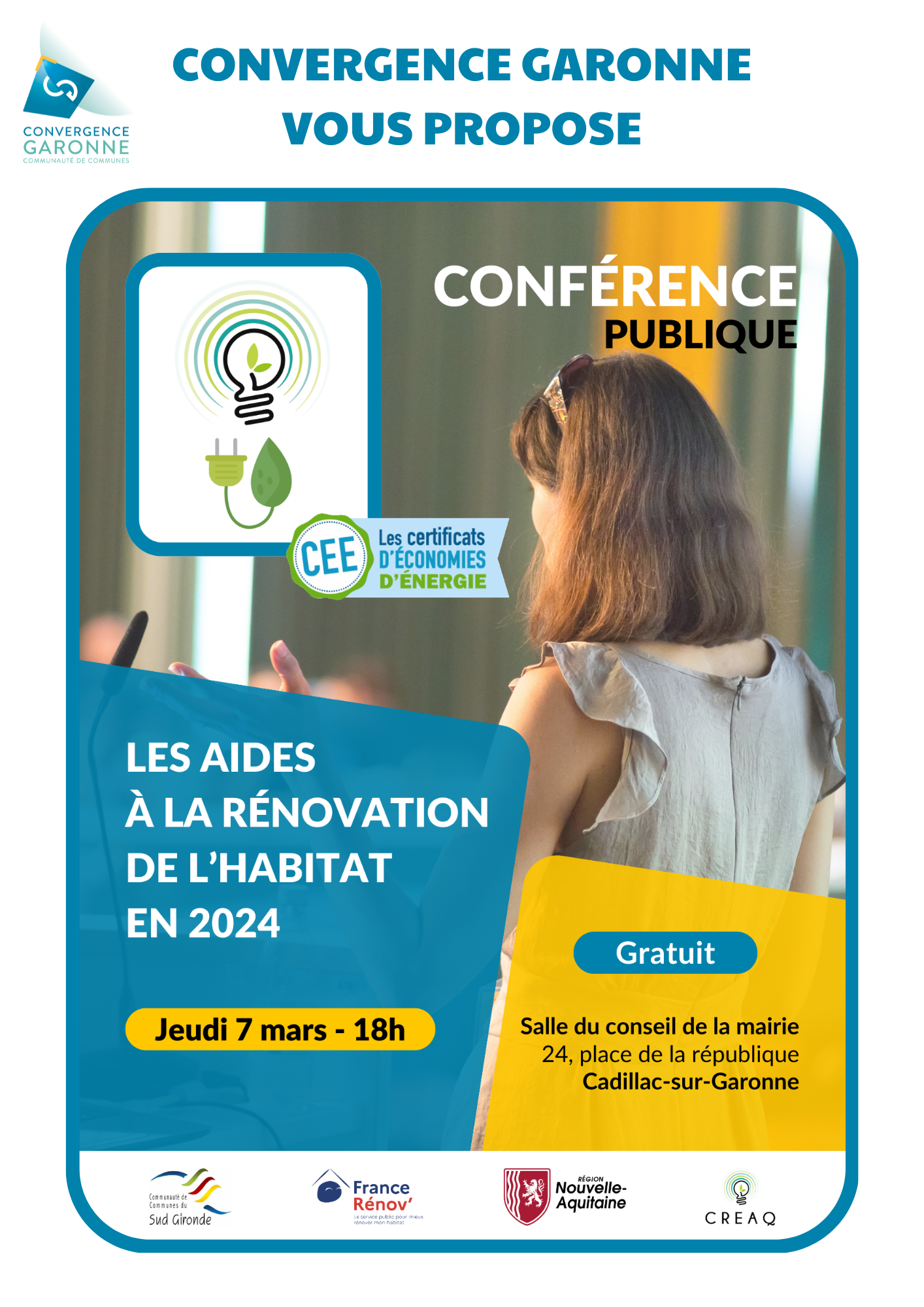 Dans le cadre de la Plateforme de rénovation énergétique France Rénov’, la Communauté de Communes Convergence Garonne, en partenariat avec la Communauté de Communes Sud-Gironde, organise une conférence publique sur le thème : les aides à la rénovation de l’habitat en 2024.