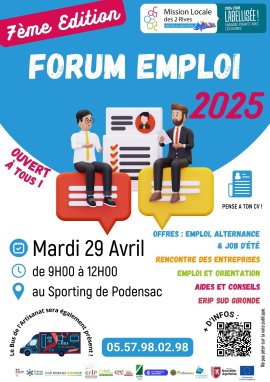 Ce forum emploi est une nouvelle fois organisé par la Mission Locale des Deux Rives, en partenariat avec France Travail Langon, Cap Emploi, l’ERIP Sud Gironde, le Pôle Territorial Sud Gironde et leurs partenaires.