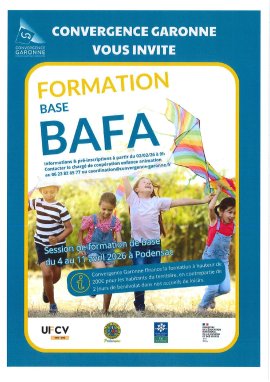 La Communauté de communes Convergence Garonne organise en partenariat avec l’UFCV et la commune de Podensac, une session de formation générale du BAFA lors des vacances du samedi 4 au samedi 11 Avril 2026.