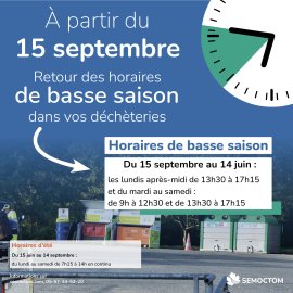 A PARTIR DU 15 SEPTEMBRE (ET JUSQU’AU 14 JUIN 2024 INCLUS), LES DECHETERIES DU SEMOCTOM PASSENT AUX HORAIRES DE BASSE SAISON.