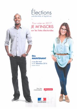 L’inscription par courrier est également possible. Le formulaire agréé est disponible sur le site du ministère de l’intérieur ou sur www.service-public.fr. Le formulaire doit être impérativement accompagné d’une copie recto-verso de la pièce d’identité ou du passeport et d’un justificatif de domicile de moins de 3 mois. Le tout doit parvenir à la Mairie le samedi 31 décembre 2016 au plus tard, le cachet de la poste faisant foi.
