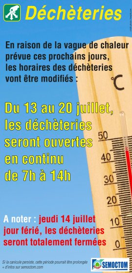 En raison de la vague de chaleur annoncée pour les jours à venir, le SEMOCTOM nous informe que les horaires des déchèteries sont modifiées de la manière suivante :
