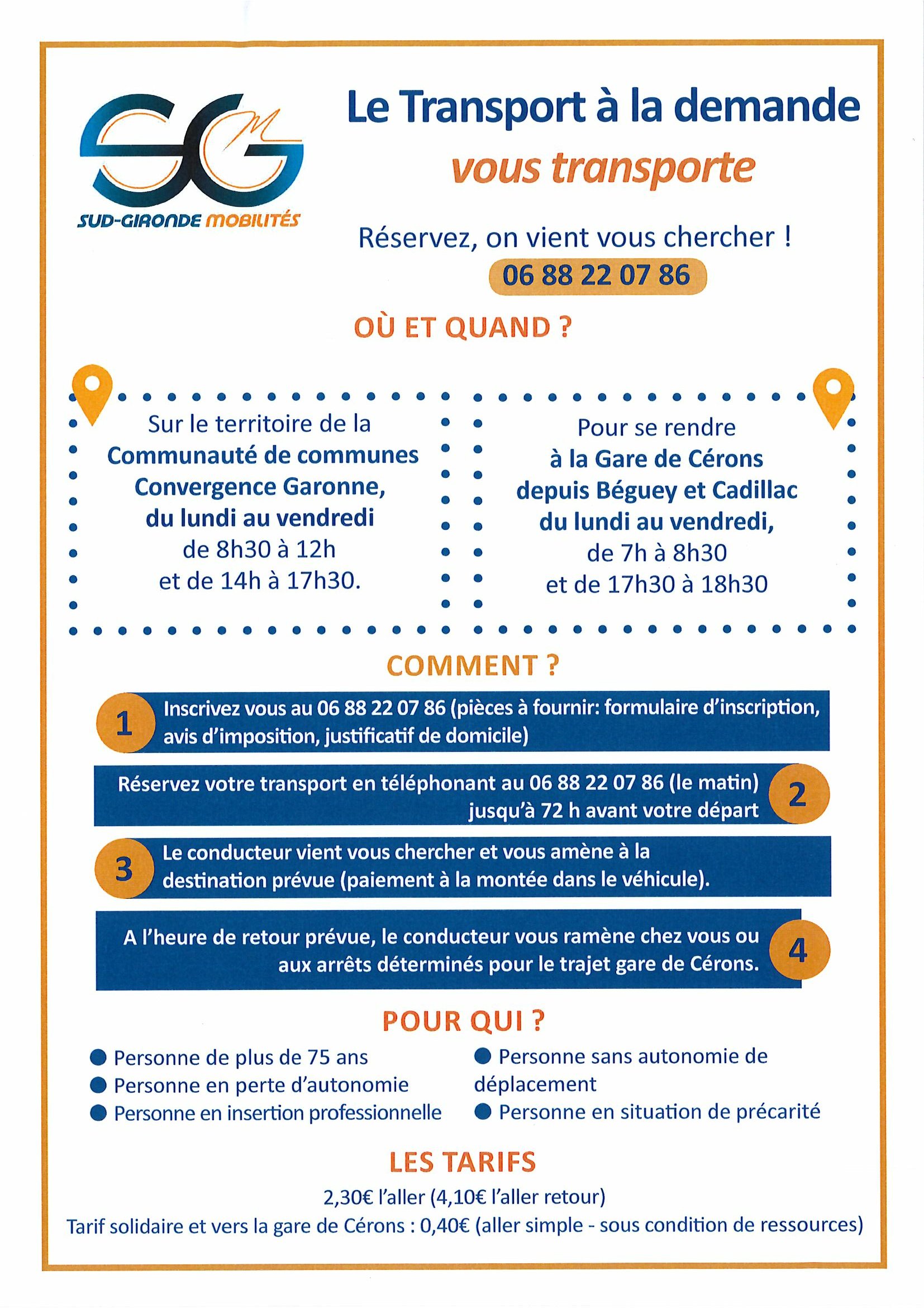 Le syndicat SUD GIRONDE Mobilités, autorité organisatrice de la mobilité pour les Communautés de Communes Convergence Garonne, Sud Gironde et Réolais en Sud Gironde, a le plaisir de vous annoncer le lancement de son offre de Transport à la Demande dès le lundi 05 Février 2024.