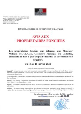 Les propriétaires fonciers sont informés que Monsieur WILLIAM MOULADE, Géomètre Principal du Cadastre, effectuera la mise à jour du plan cadastral de la commune de BEGUEY :