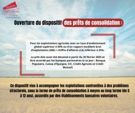 Le dispositif de prêts de consolidation est désormais pleinement opérationnel suite à l’ouverture le 17 avril 2025 de la plateforme de FranceAgrimer pour le dépôt des demandes de remboursement des commissions de garantie de BpiFrance.