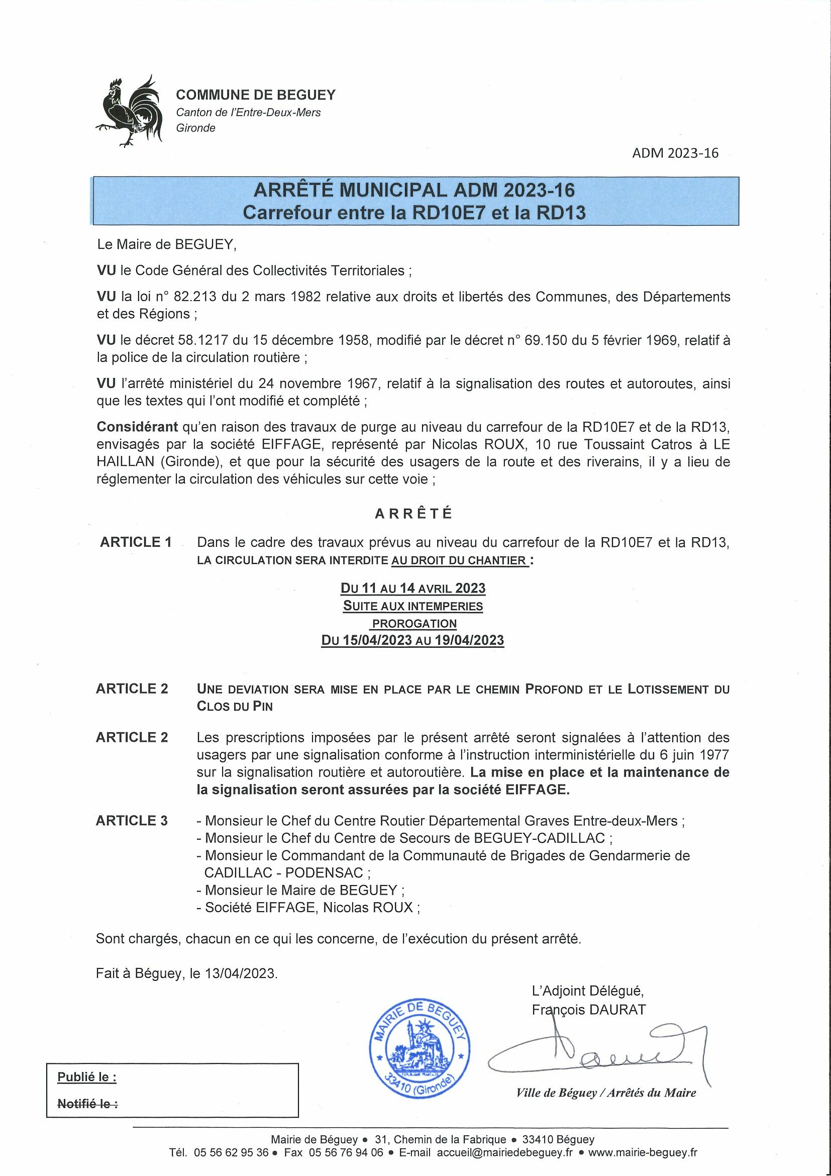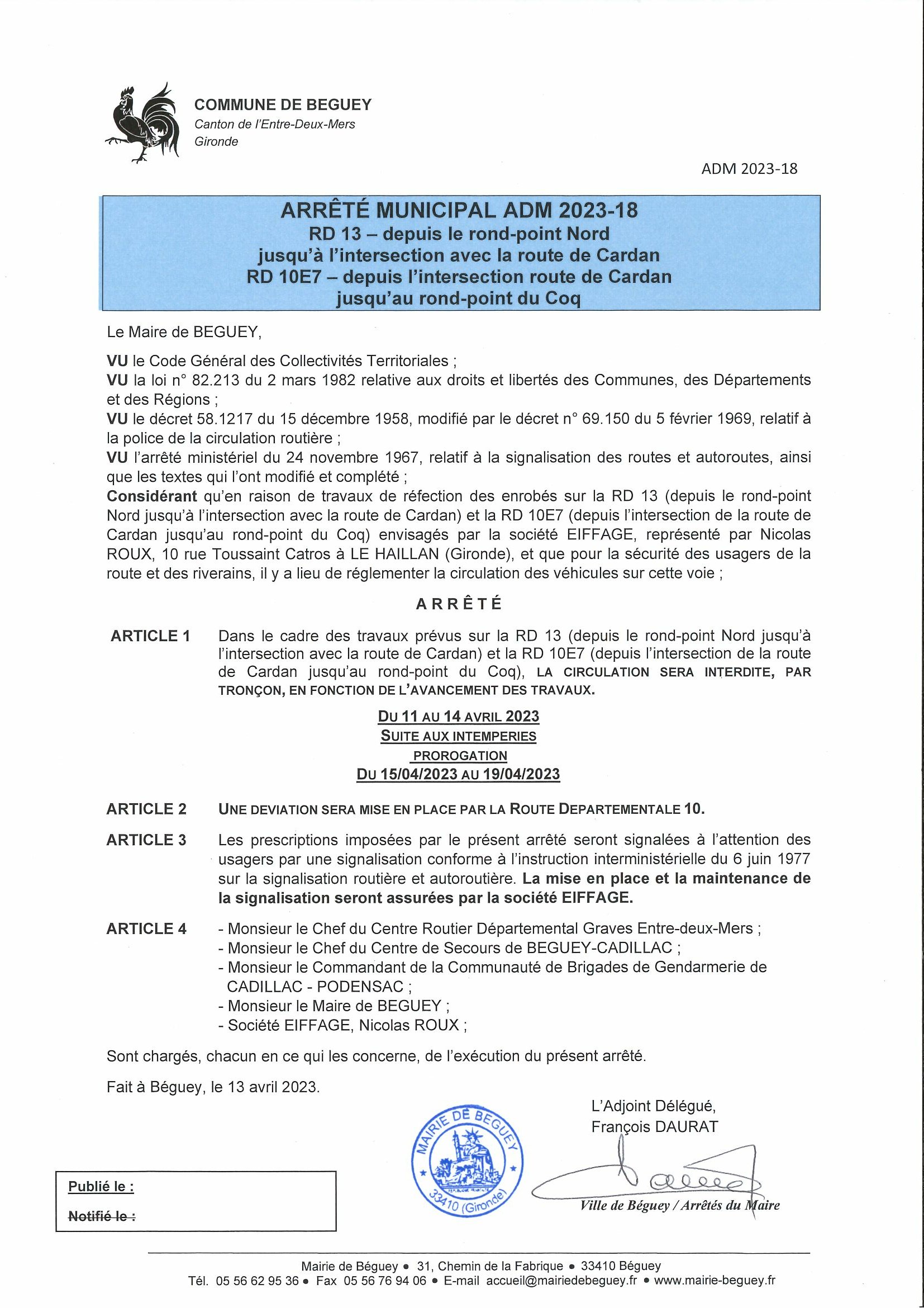 PROROGATION DES ARRETES DE CIRCULATION - TRAVAUX SUR RD 10E7 (avenue de la Libération) ET RD 13 (route de Cardan)