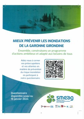 Le Syndicat Mixte d’Etudes et d’Aménagement de la Garonne (SMEAG) souhaite mener une enquête auprès de la population de notre commune concernant la perception des inondations, dans le cadre de l’élaboration du Programme d’Actions de Prévention des Inondations (PAPI) de la Garonne girondine.