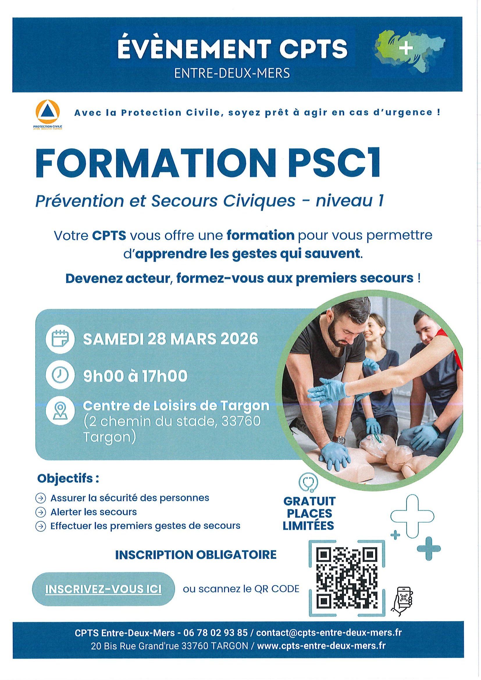 La Communauté Professionnelle Territoriale de Santé (CPTS) de l’Entre-Deux-Mers organise une formation Prévention et Secours Civiques de niveau 1 (PSC1) à destination des habitants du territoire.