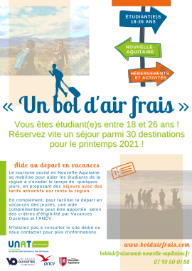 L’UNAT Nouvelle-Aquitaine, tête de réseau du tourisme social et associatif de la région, engagée en faveur d’un tourisme ouvert à tous, a souhaité mettre en place un dispositif d’aide au départ en vacances pour les étudiants de la région Nouvelle-Aquitaine.