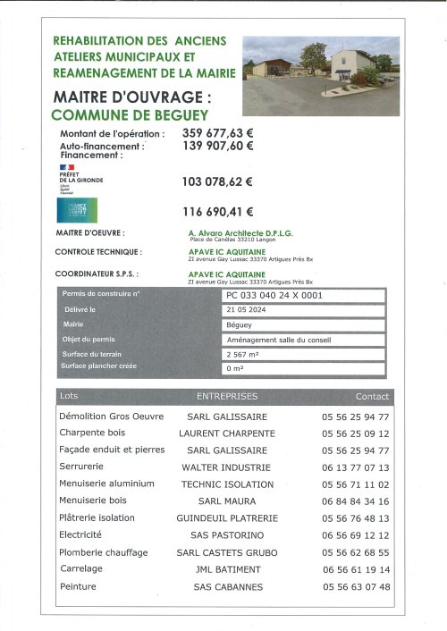 Le Conseil Municipal de la commune de Béguey a décidé de réhabiliter la mairie, et plus précisément ses anciens ateliers municipaux, situés 31 chemin de la Fabrique, ainsi que de réaménager l’actuelle mairie, afin d’offrir une plus grande qualité d’accueil et de travail.