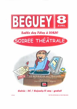 "Le Bonheur au travail"Une comédie de Isabelle GROLIERMise en scène Jean-Claude PALISSAT-BEGARIE – Entrée : 8 € – Enfants - de 12 ans : gratuit