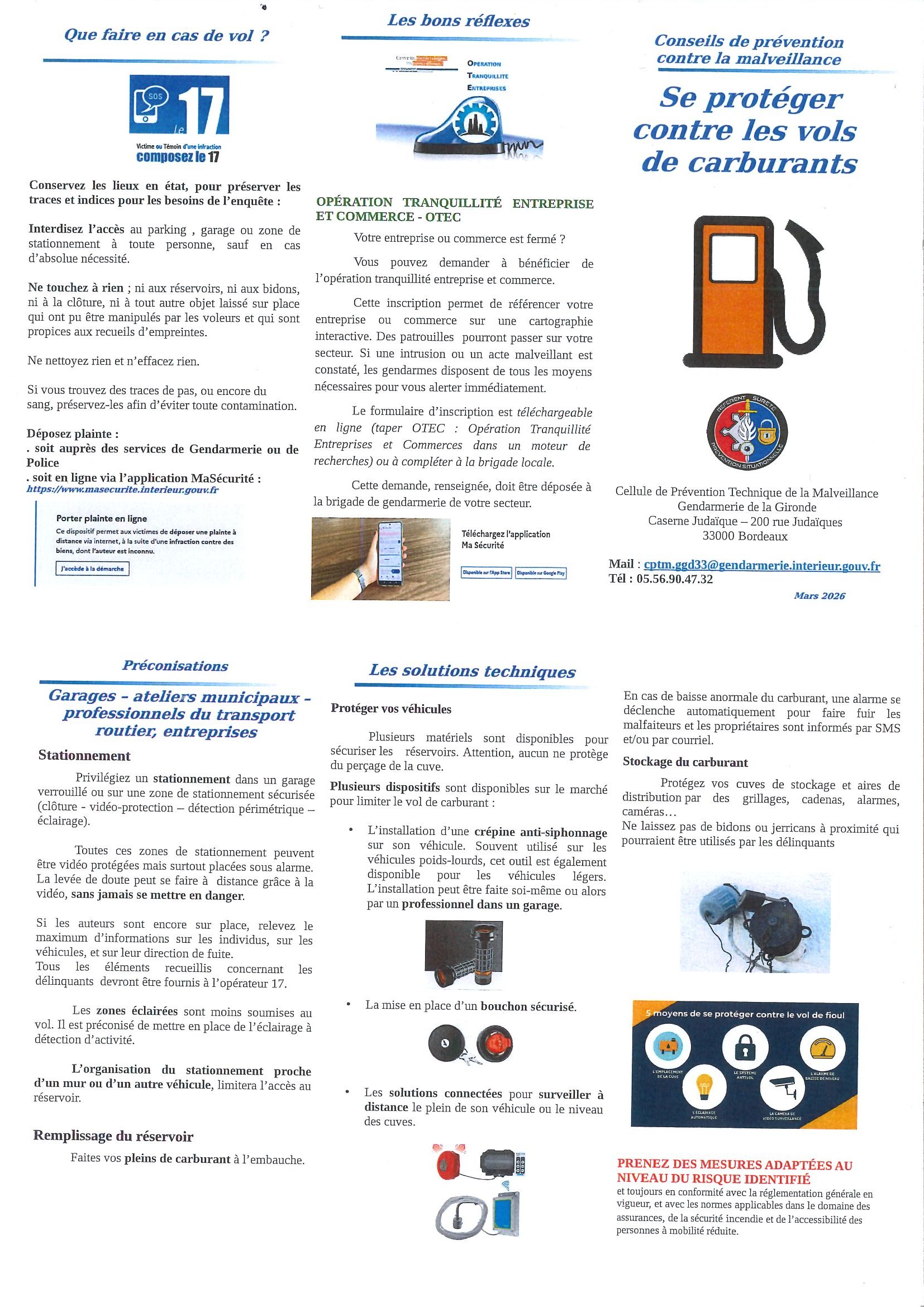 Compte tenu de la conjoncture actuelle, les services de la Communauté de Brigades de Gendarmerie de CADILLAC / PODENSAC diffusent un message de prévention relatif au vol de carburant, ainsi que quelques conseils afin de s’en prémunir.